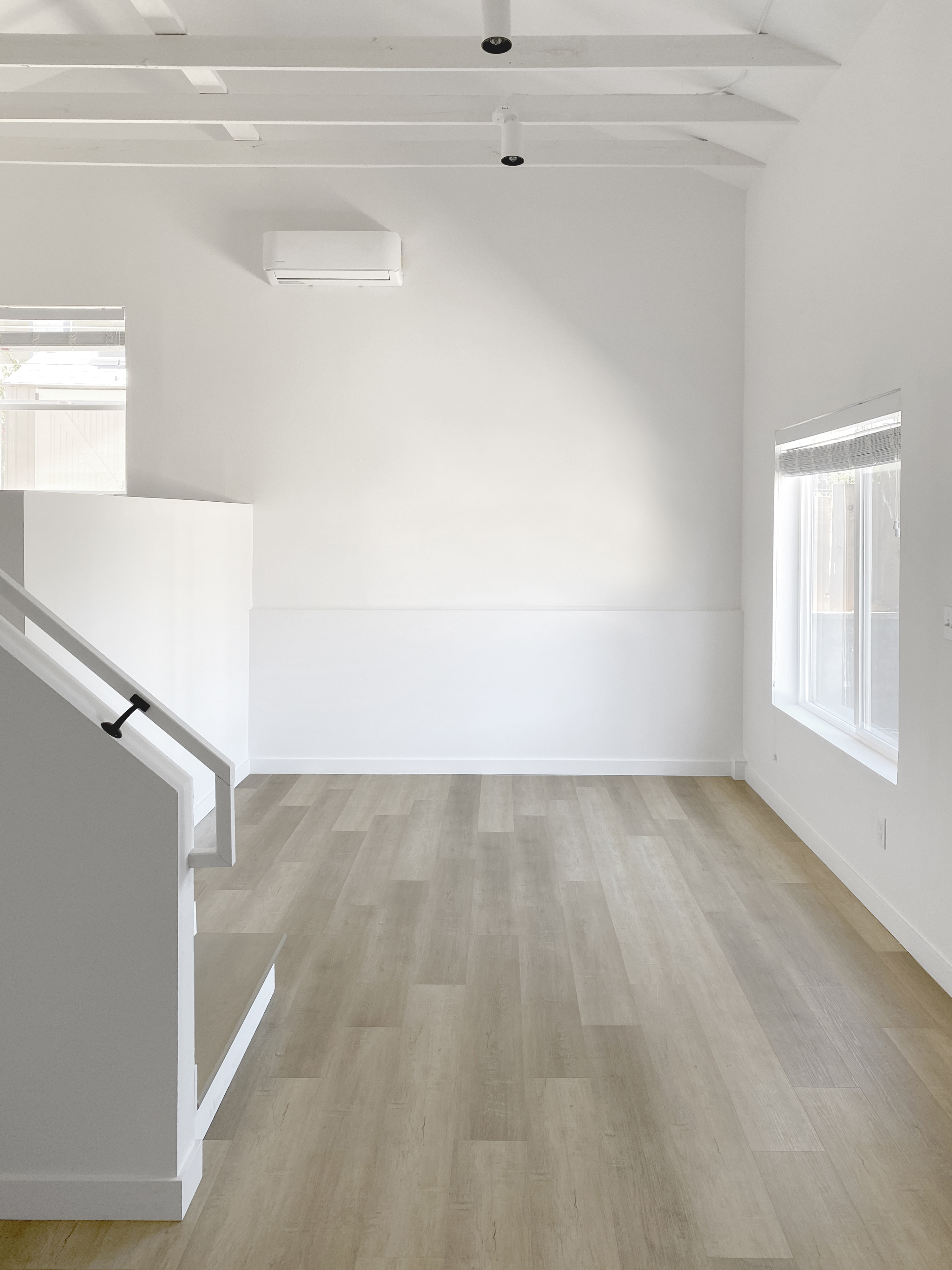 The existing windowless, 2-car garage underwent a complete transformation to maximize its limited square footage. Collaborating closely with the client, we strategically partitioned the space to create a luxurious studio within the confines of a compact area.